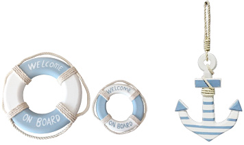 ¥3900 ブルー/ナチュラル 65×46cm | イカリAGオーナメントS 白/赤/青 ¥700 17×14.5cm | 装飾用スクリューL ¥3500 直径60p | 装飾用木製滑車AG ナチュラル ¥3500 19(36)×8.5cm |